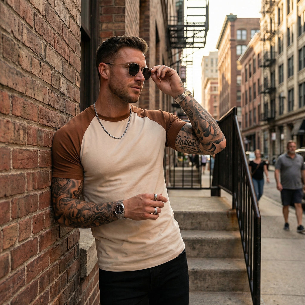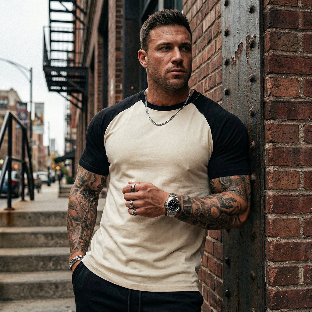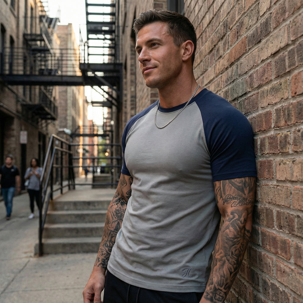 A Camiseta Masculina Modelo Denver traz o clássico estilo Raglan (mangas em cor contrastante) para o visual urbano. Com design bicolor e corte moderno, é a escolha certa para quem busca um look casual com personalidade.
