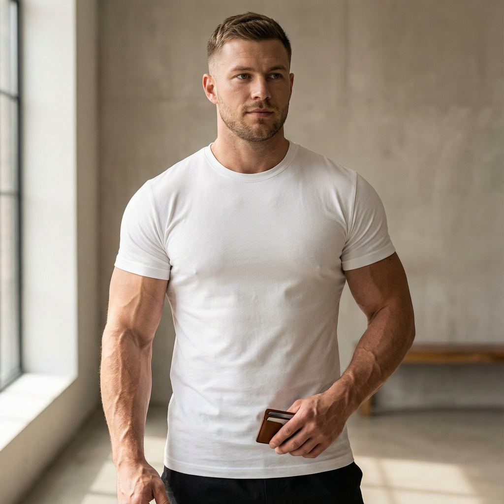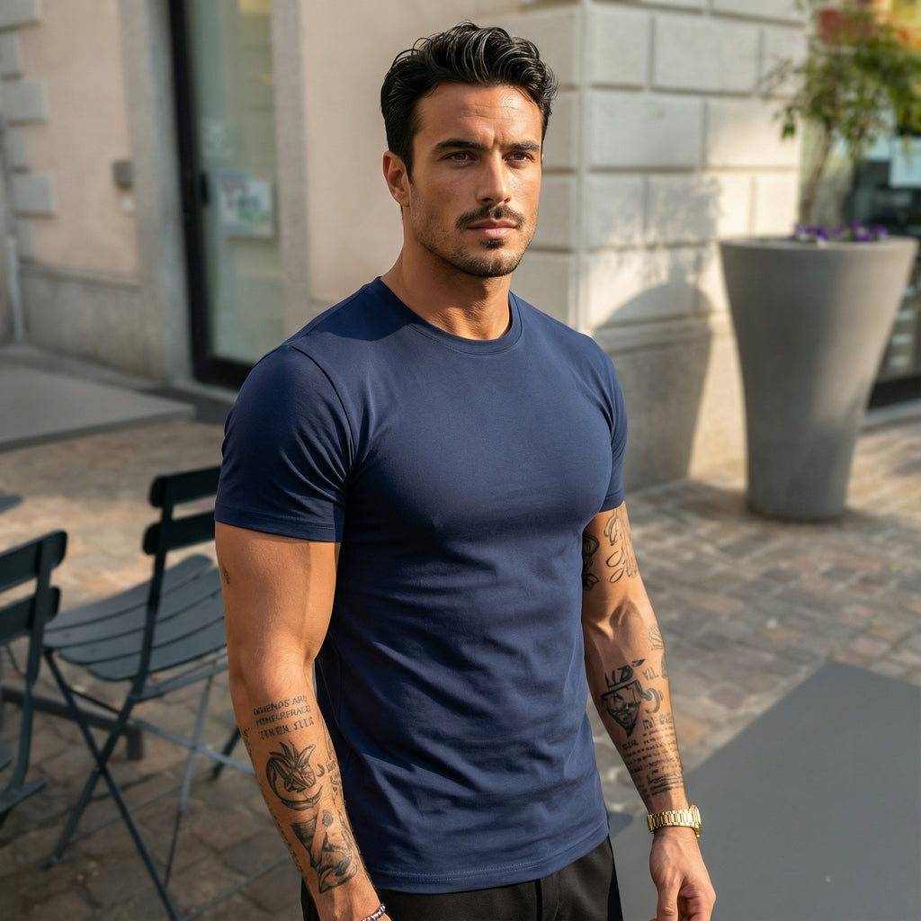 A Camiseta Masculina Modelo Bernard oferece o caimento perfeito da Viscolycra. Conhecida pela leveza e toque gelado, é a peça ideal para quem busca conforto extremo e ajuste que valoriza o corpo sem apertar.