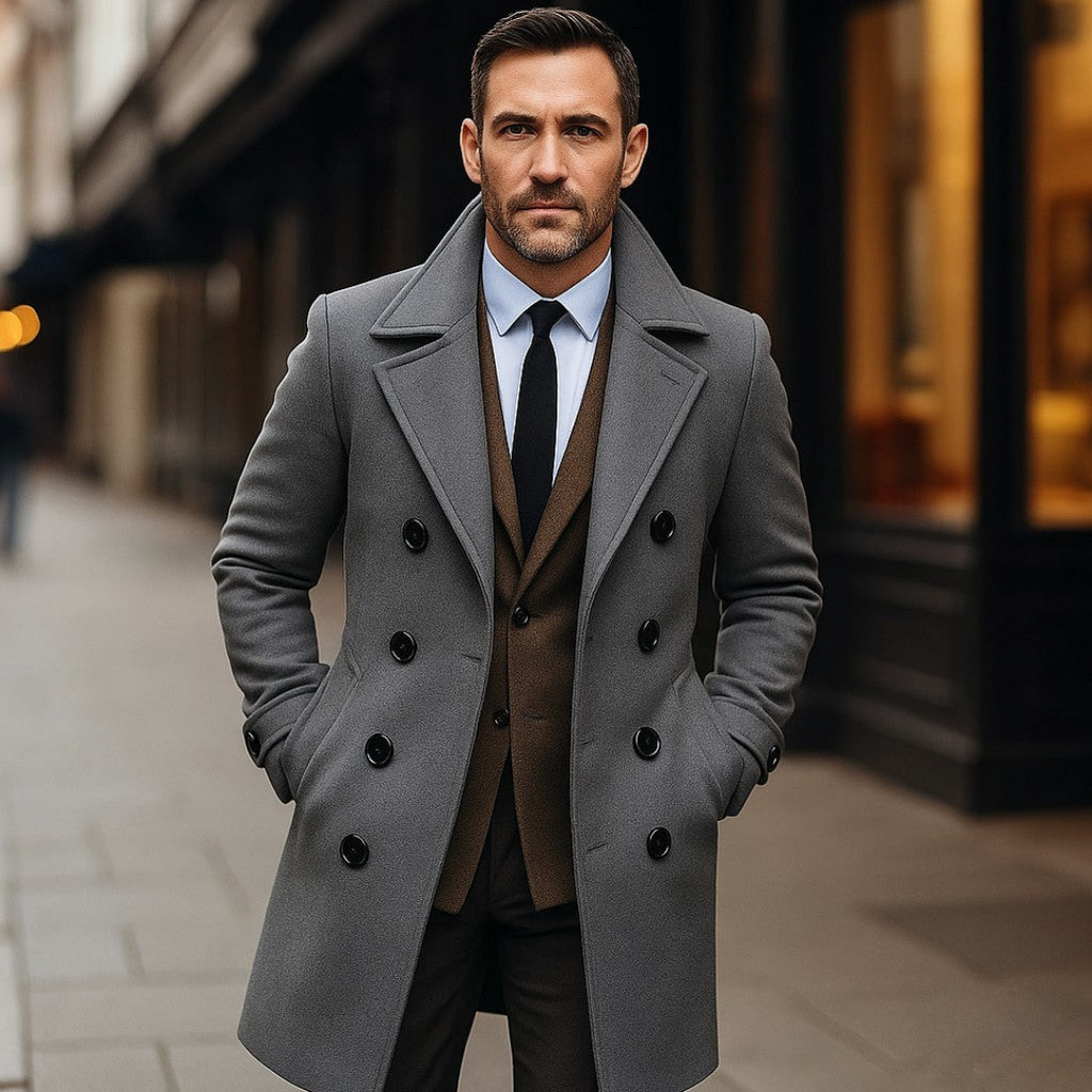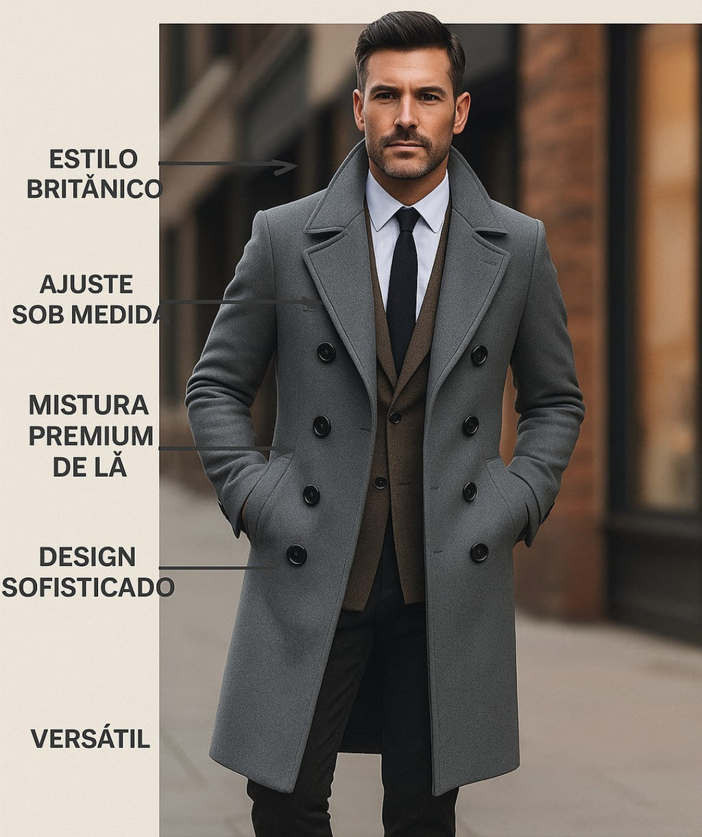 Casaco Sobretudo Masculino Cinza - Cavil é a peça essencial para o homem moderno que busca elegância, conforto e presença marcante nos dias mais frios. Inspirado no estilo britânico clássico e adaptado à elegância urbana contemporânea, ele oferece um visual impecável em qualquer ocasião.