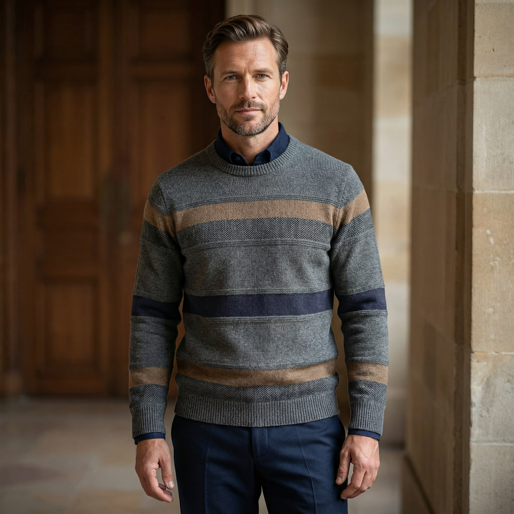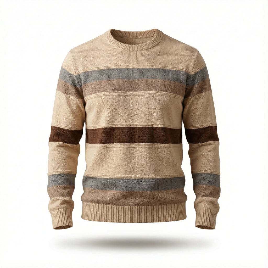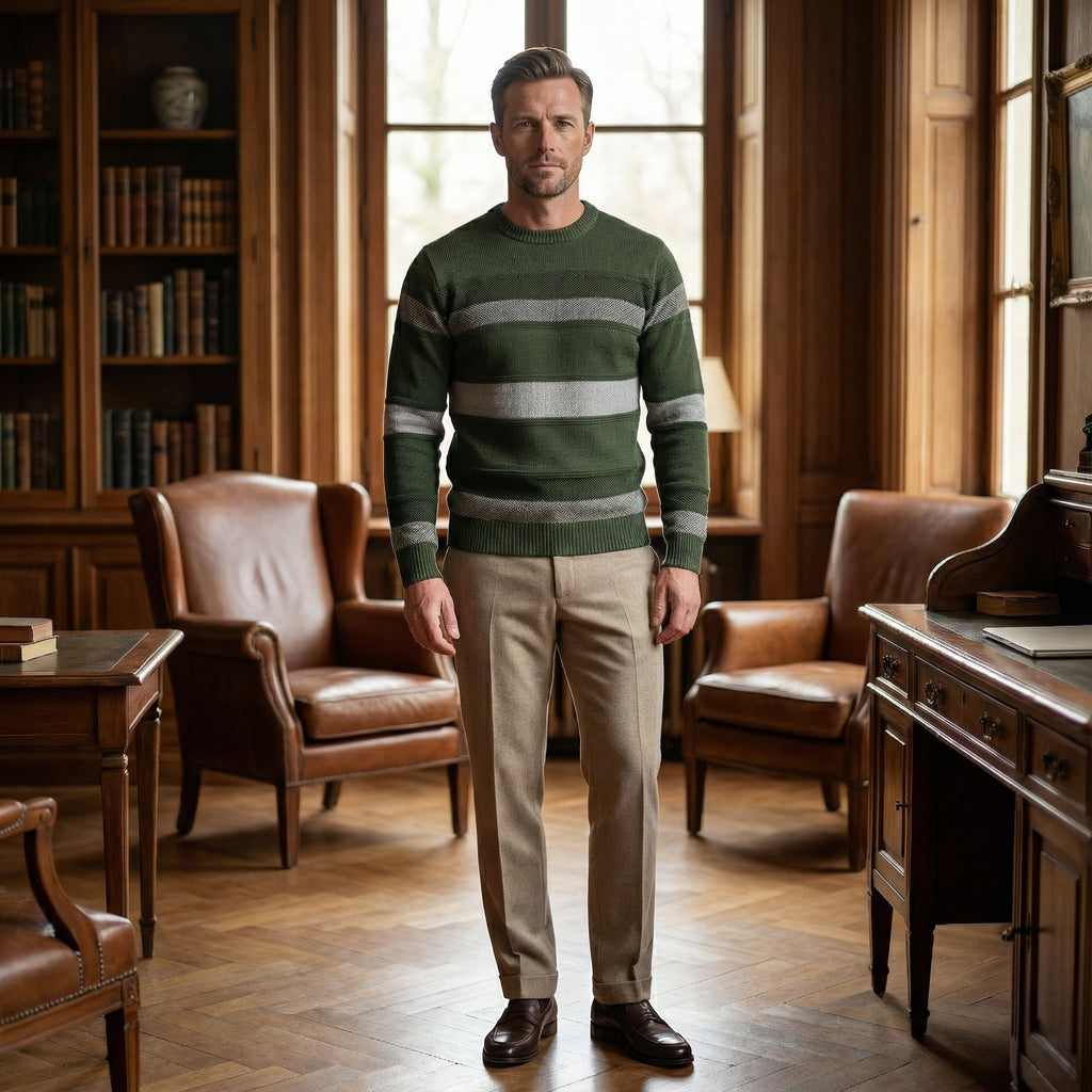 - Estilo Clássico: Gola redonda e padronagem em listras largas que combinam facilmente com jeans ou calças de sarja.