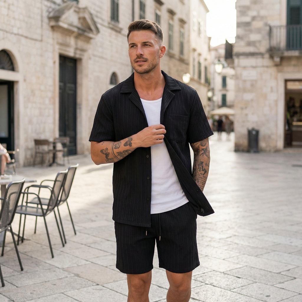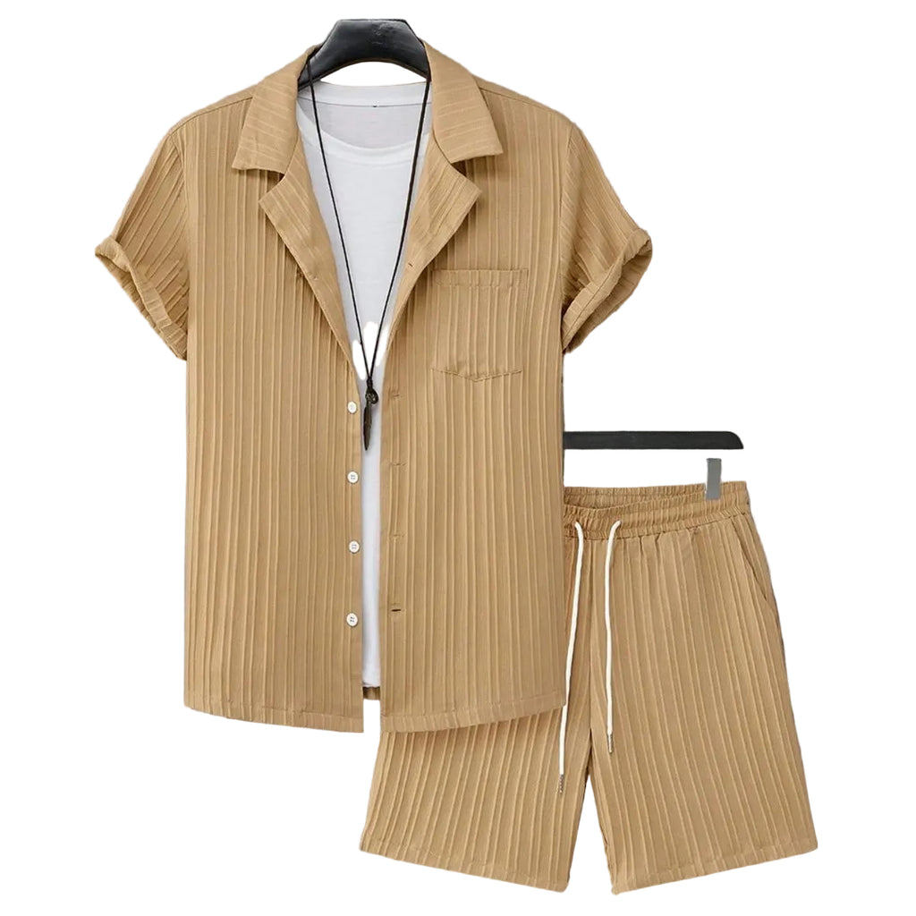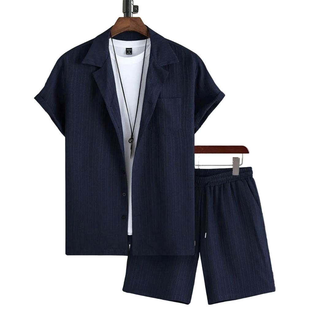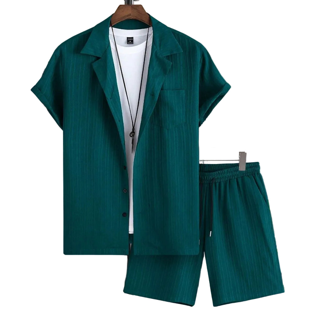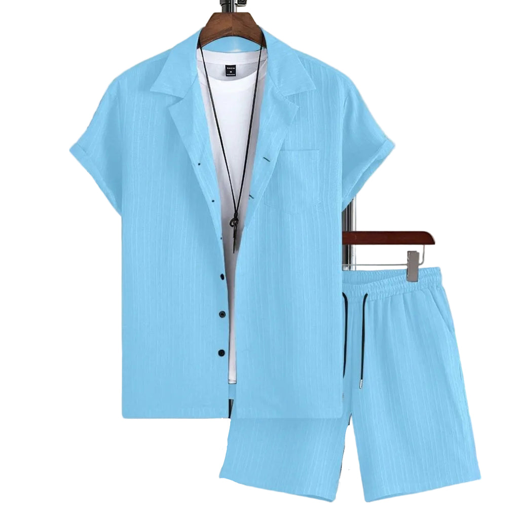 O Conjunto Masculino Modelo Dominick é a solução completa para quem busca um visual alinhado e fresco. Composto por camisa de botões e shorts coordenados, oferece a praticidade de um look pronto com a elegância do estilo resort.