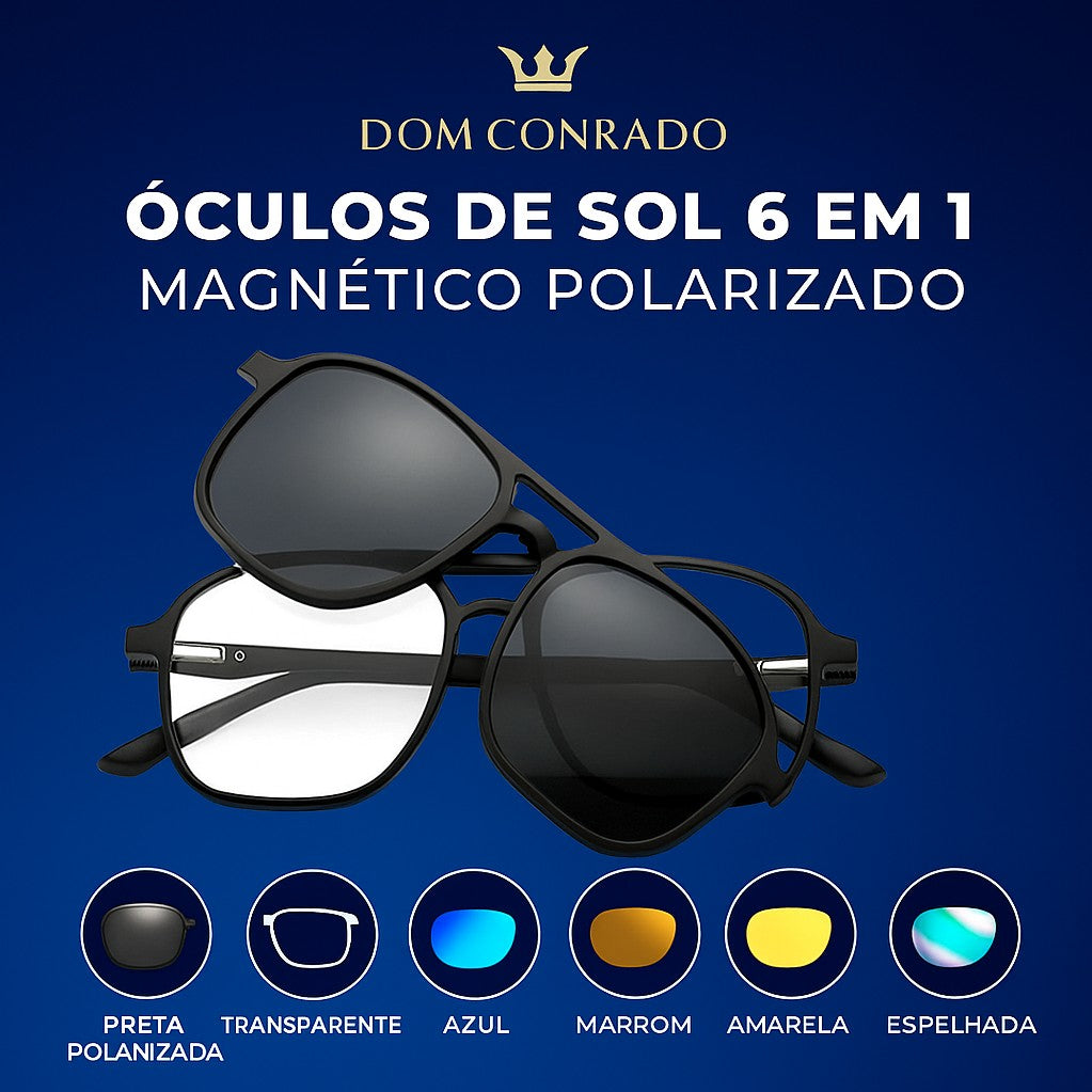 Óculos de Sol Masculino 6 em 1 da Dom Conrado é a solução perfeita para homens modernos que precisam de funcionalidade e elegância no dia a dia. Com um sistema magnético inovador, você troca facilmente as lentes conforme o ambiente e a necessidade — ideal para quem dirige, trabalha ao ar livre ou busca estilo em todas as ocasiões.